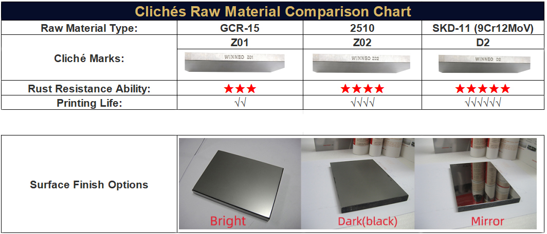 WINNEO ADVICE: The common steel (such as the GCr15 or 2510# steel material) cliché plates can be reground and reuse 2 or 3 times, and the Chrome steel cliché plates (such as the D2), you can reuse 5 times or more.