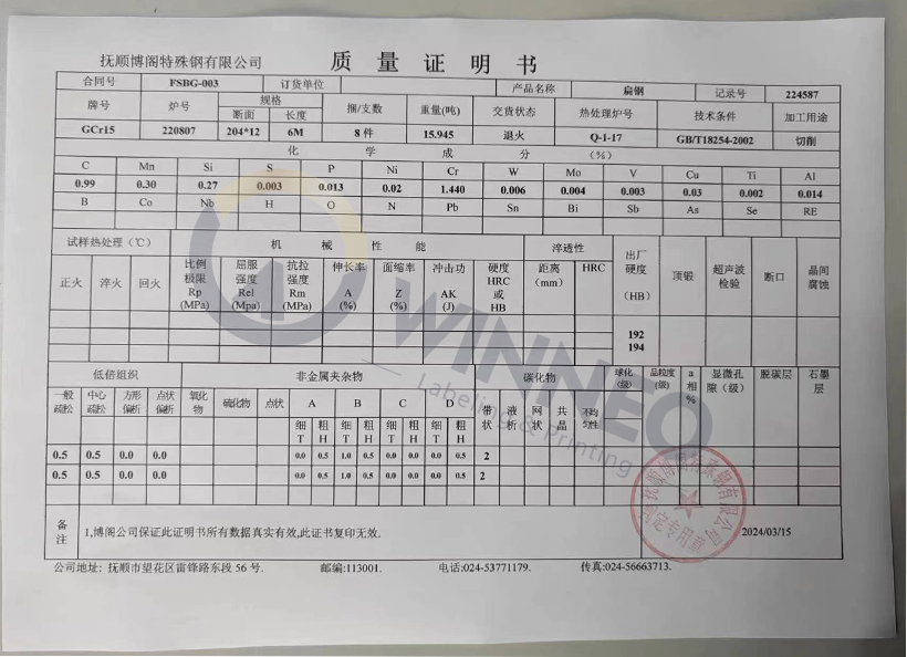 นี่คือรายงานการทดสอบองค์ประกอบต้นฉบับสำหรับวัตถุดิบที่ใช้ในแผ่นพิมพ์แพดของ WINNEO รายงานนี้พิสูจน์ว่าวัตถุดิบที่ใช้ในแผ่นพิมพ์แพดของเราเป็นไปตามมาตรฐานคุณภาพ วัตถุดิบที่ผ่านการรับรองคุณภาพช่วยให้มั่นใจได้ว่าการผลิตแผ่นเหล็กในขั้นตอนต่อไปจะเป็นไปตามมาตรฐานที่เกี่ยวข้อง