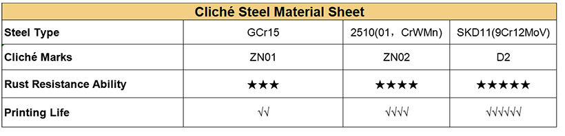 แผ่น Cliché ที่มีคุณภาพดี ควรมีความแข็งในการอบชุบด้วยความร้อนที่คงที่ภายในความหนา 0.3 มม. ของพื้นผิว และโดยปกติแล้ว เราจะแกะสลักภาพลงบนแผ่น Cliché ประมาณ 0.02~0.04 มม. ในแต่ละครั้ง ดังนั้น โปรดอย่าทิ้งแผ่น Cliché หลังการใช้งานครั้งแรก สามารถนำไปเจียรใหม่โดยผู้ผลิตมืออาชีพ แล้วนำกลับมาใช้ใหม่ได้