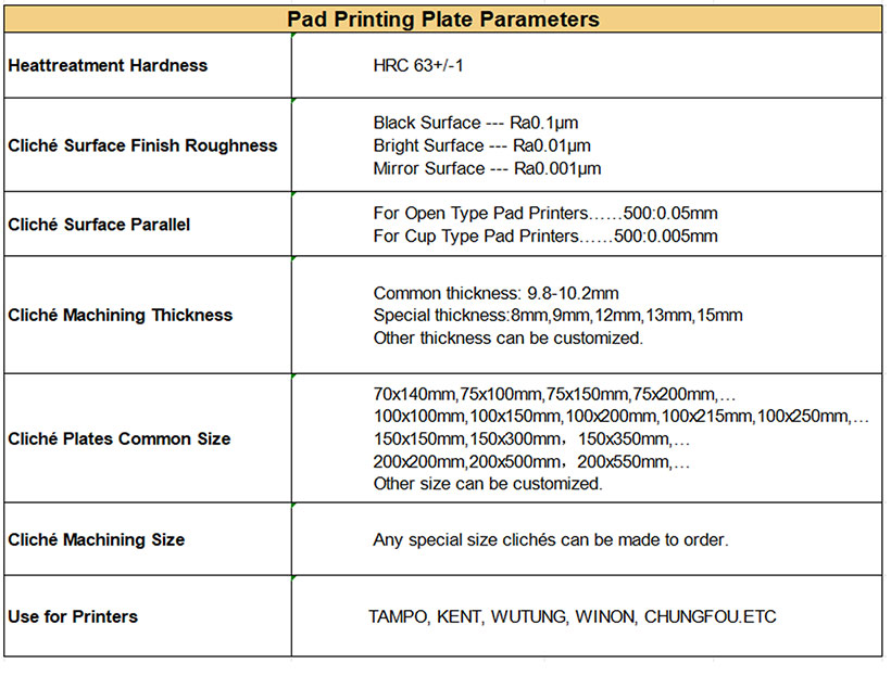 แผ่นเพลทของเราทำจากเหล็กอัลลอยด์คุณภาพสูงที่มีความแข็งคงที่ ช่วยให้ขอบของลายพิมพ์ไม่สึกหรอหรือเสียรูประหว่างการพิมพ์ระยะยาว เหมาะอย่างยิ่งสำหรับการพิมพ์แพดที่มีความถี่สูงและความแม่นยำสูง